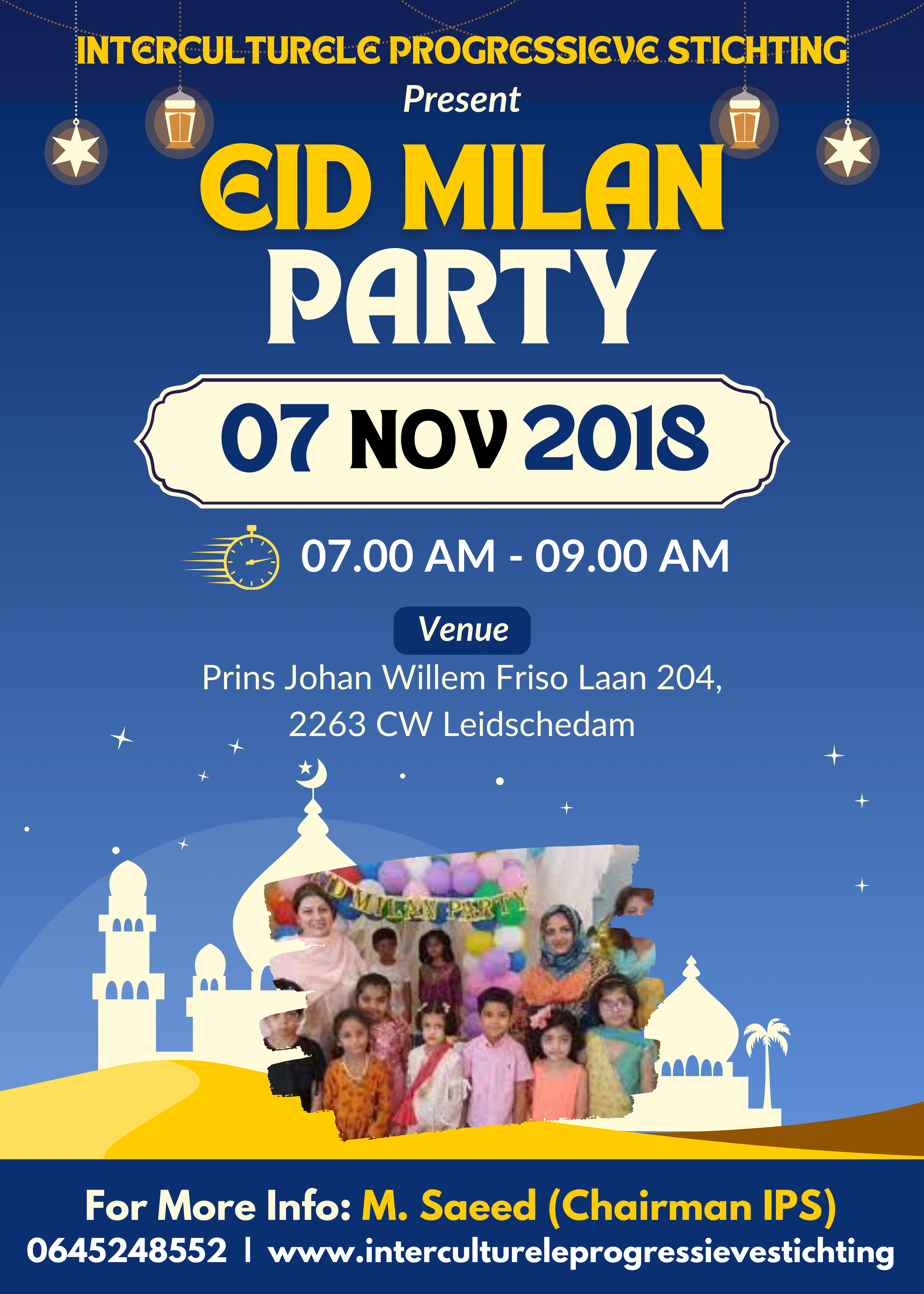 Leidschendam, Netherlands – The Intercultural Progressive Foundation (IPS) is hosting an Eid Milan Party on Wednesday, November 7th, 2018, from 7:00 AM to 9:00 AM at Prins Johan Willem Friso Laan 204, 2263 CW Leidschendam.