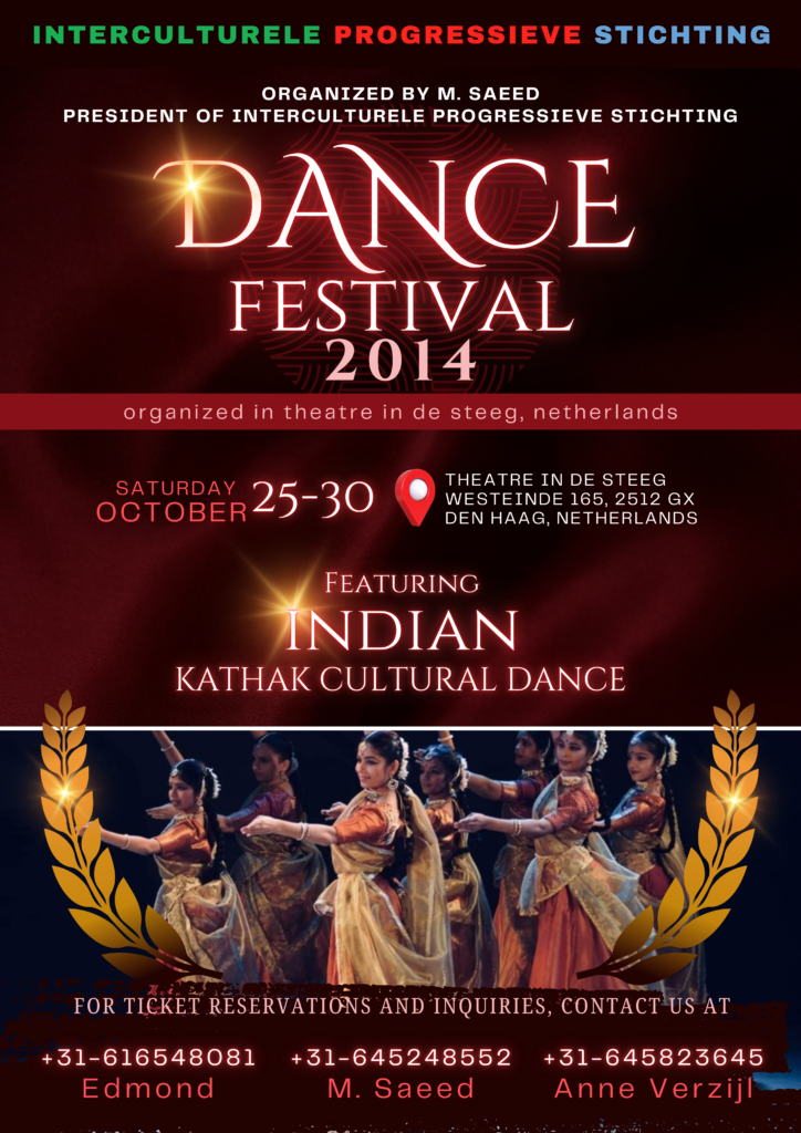 The Hague, Netherlands β The Intercultural Progressive Foundation (IPS) is proud to present Dance Festival 2014, a celebration of Indian Kathak cultural dance. The festival will take place from Saturday, October 25th to Wednesday, October 30th at Theatre in de Steeg, Westeinde 165, 2512 GX, The Hague, Netherlands.